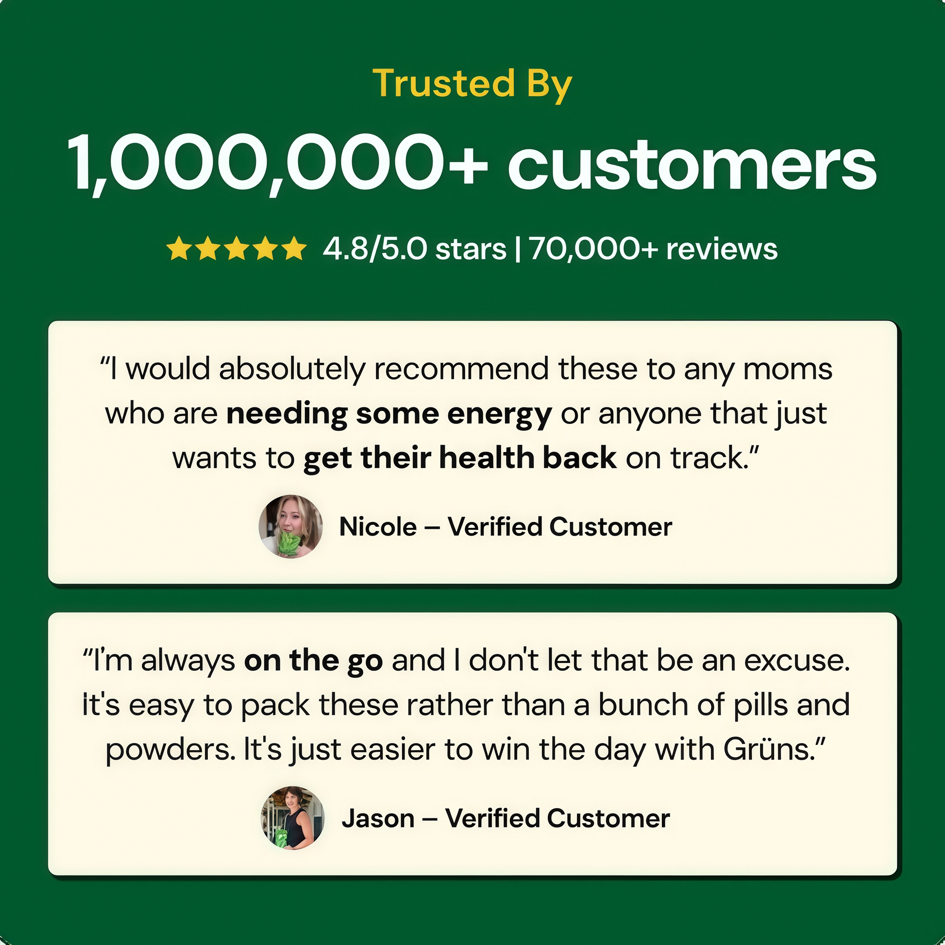 "As a former pro athlete, I've always looked for ways to stay sharp, feel my best, and fuel my body without overcomplicating it. Grüns uses clean ingredients that actually deliver, and I love that it makes better health accessible to everyone, whether you're training at the highest level or just trying to make good choices every day."